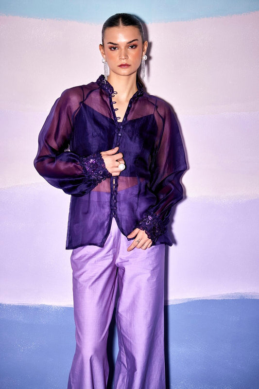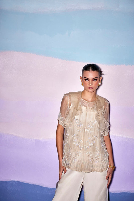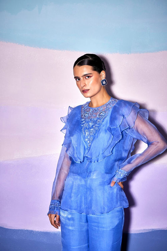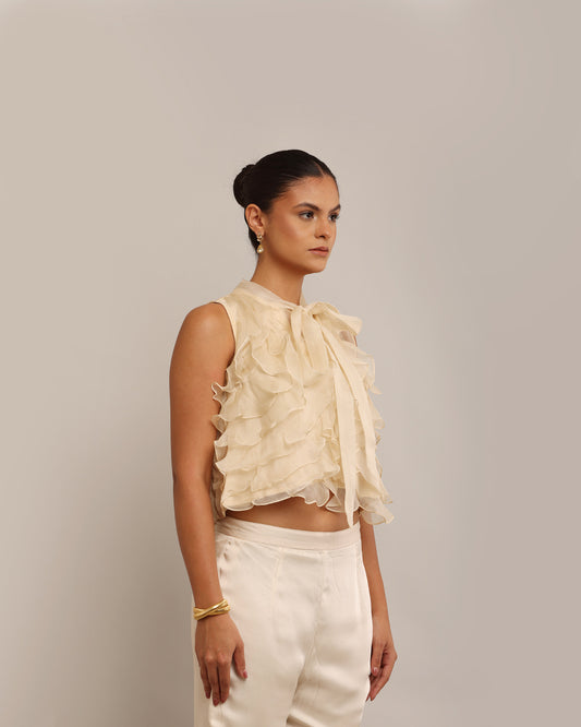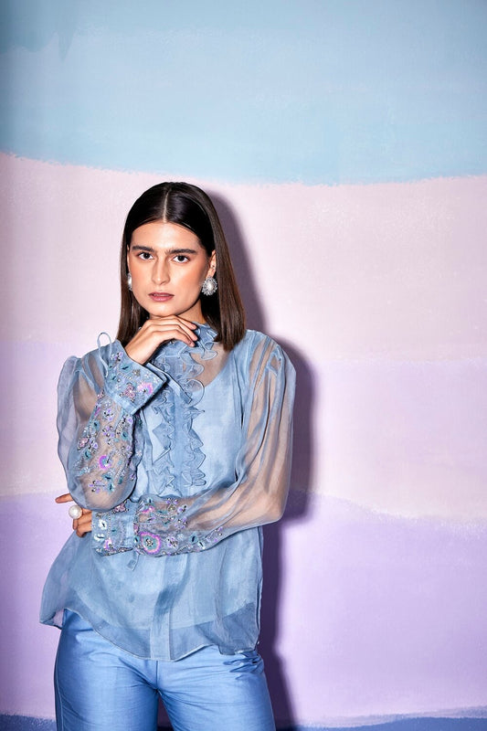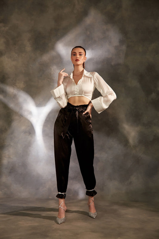 BLACK FRONT FRILL TOP & SILK PANTS – AW9