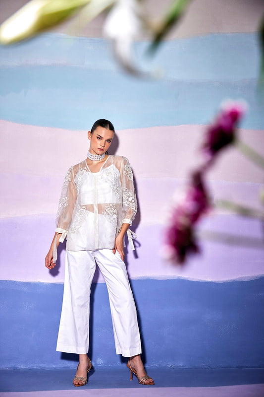 BLACK FRONT FRILL TOP & FLORAL BLACK PANTS – AW10