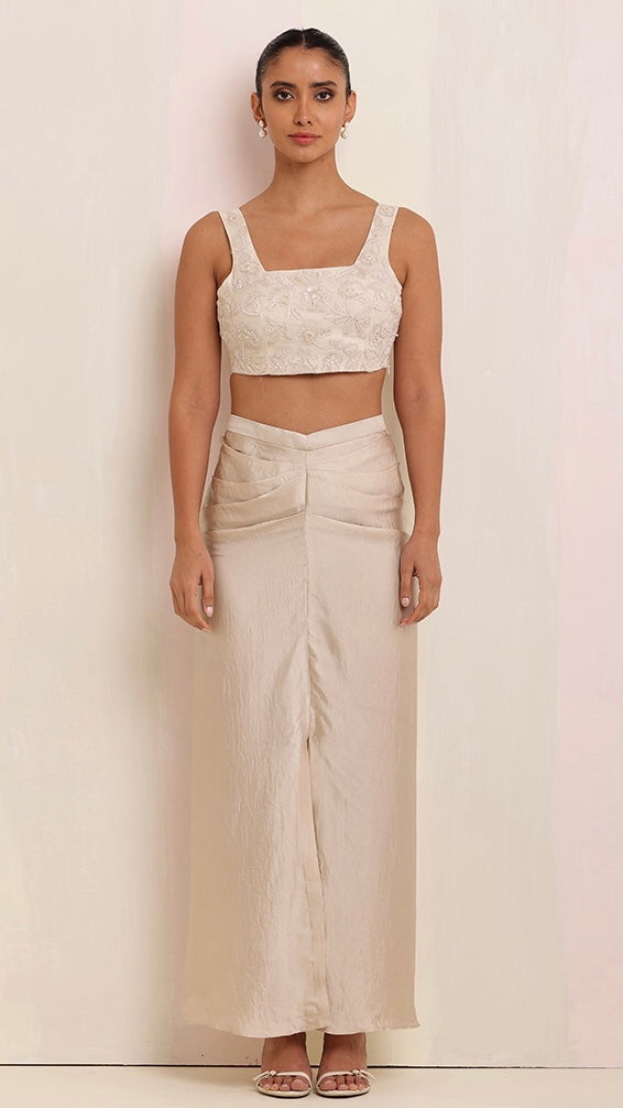 An exquisite display of artistry and elegance, the ivory-tone embroidered cape jacket over an intricately detailed crop top, paired with a flowing drape skirt, exudes sophisticated charm and timeless beauty.