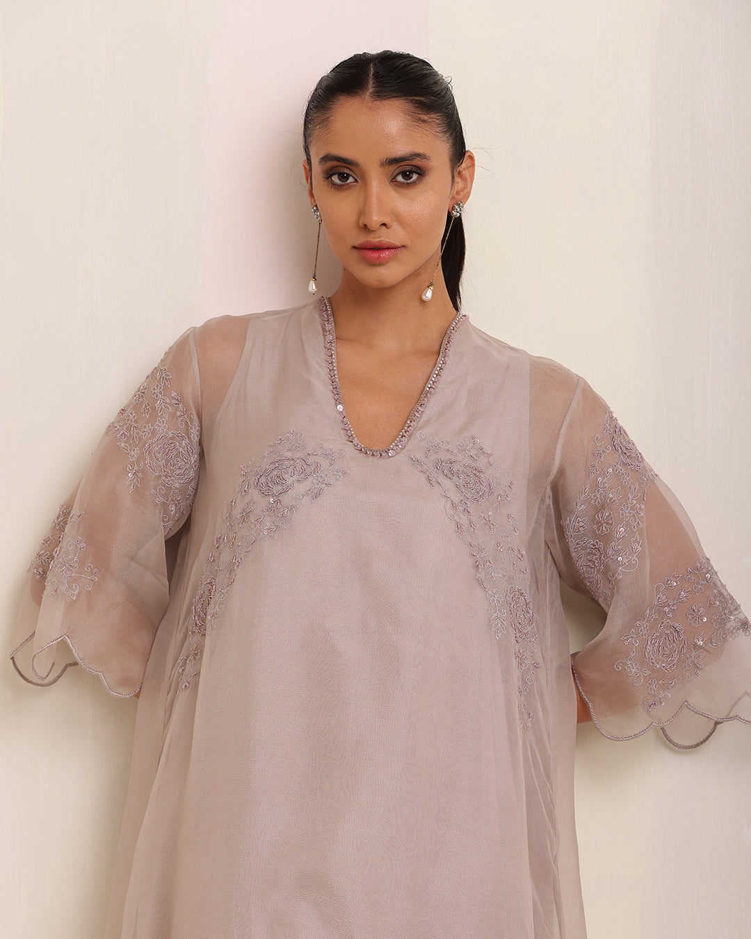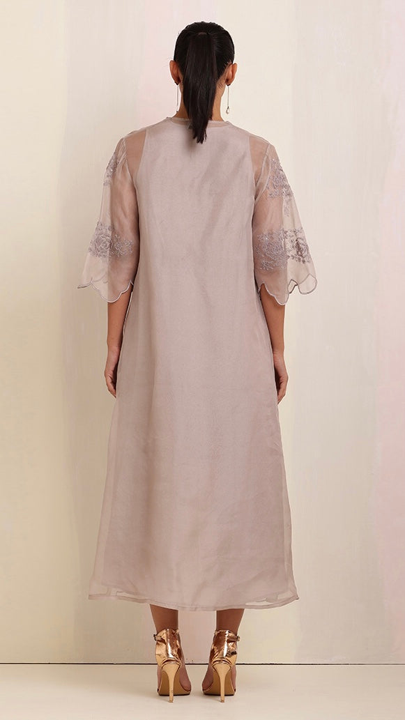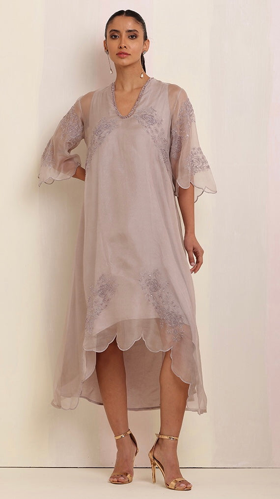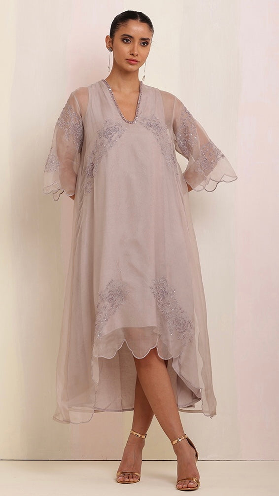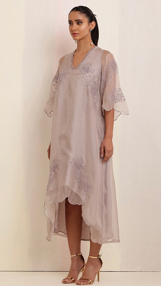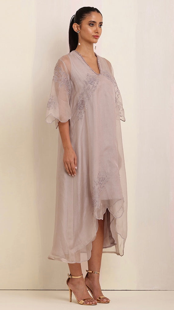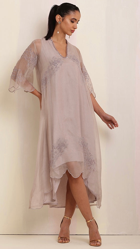 Gracefully flowing and intricately adorned, this grey-toned dress with exquisite hand embroidery captures the essence of timeless beauty and artisanal craftsmanship