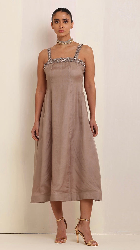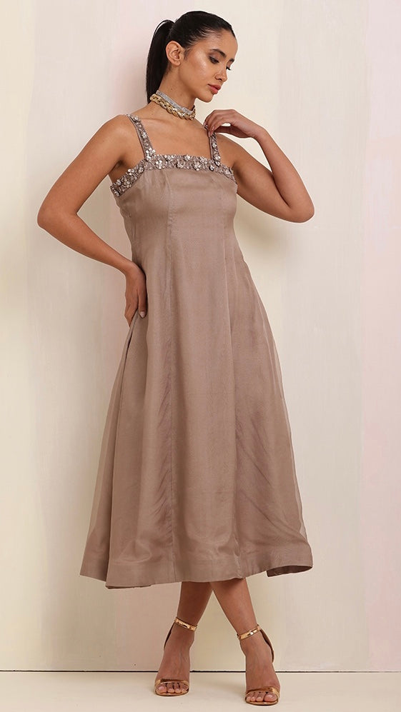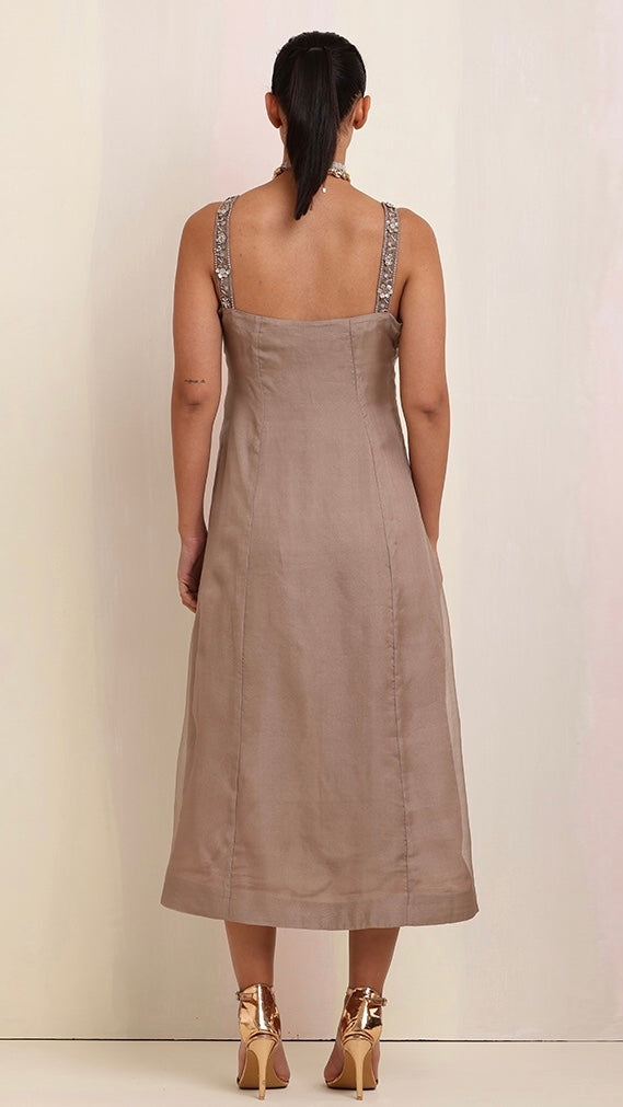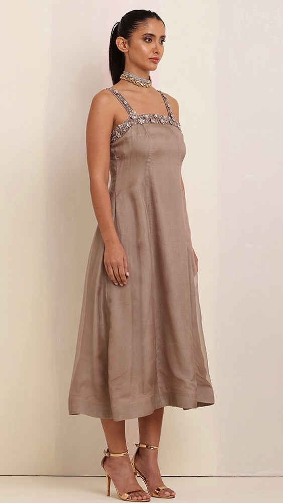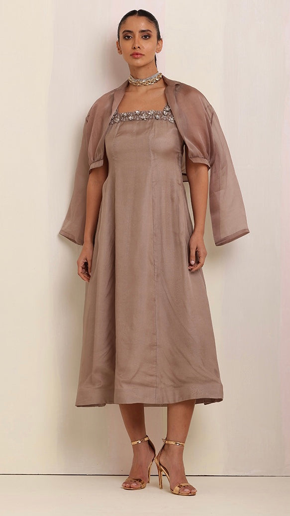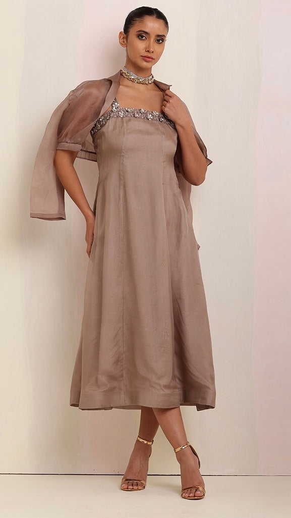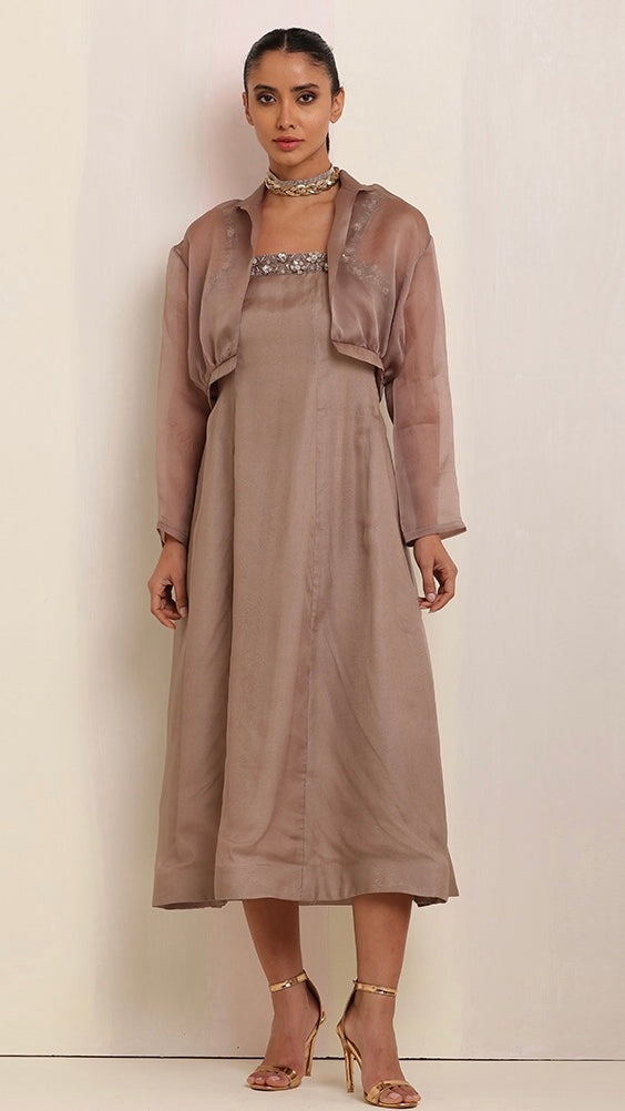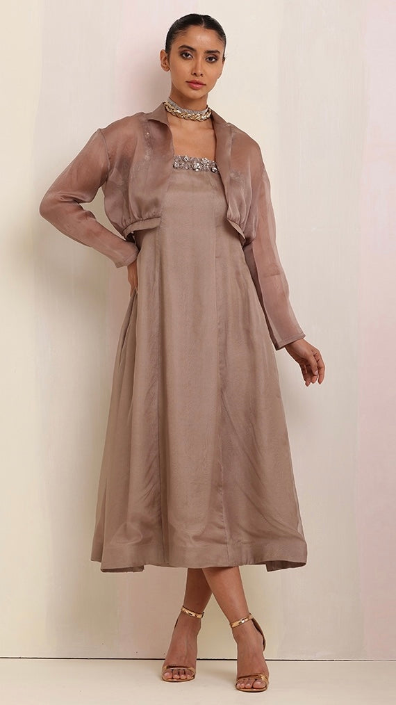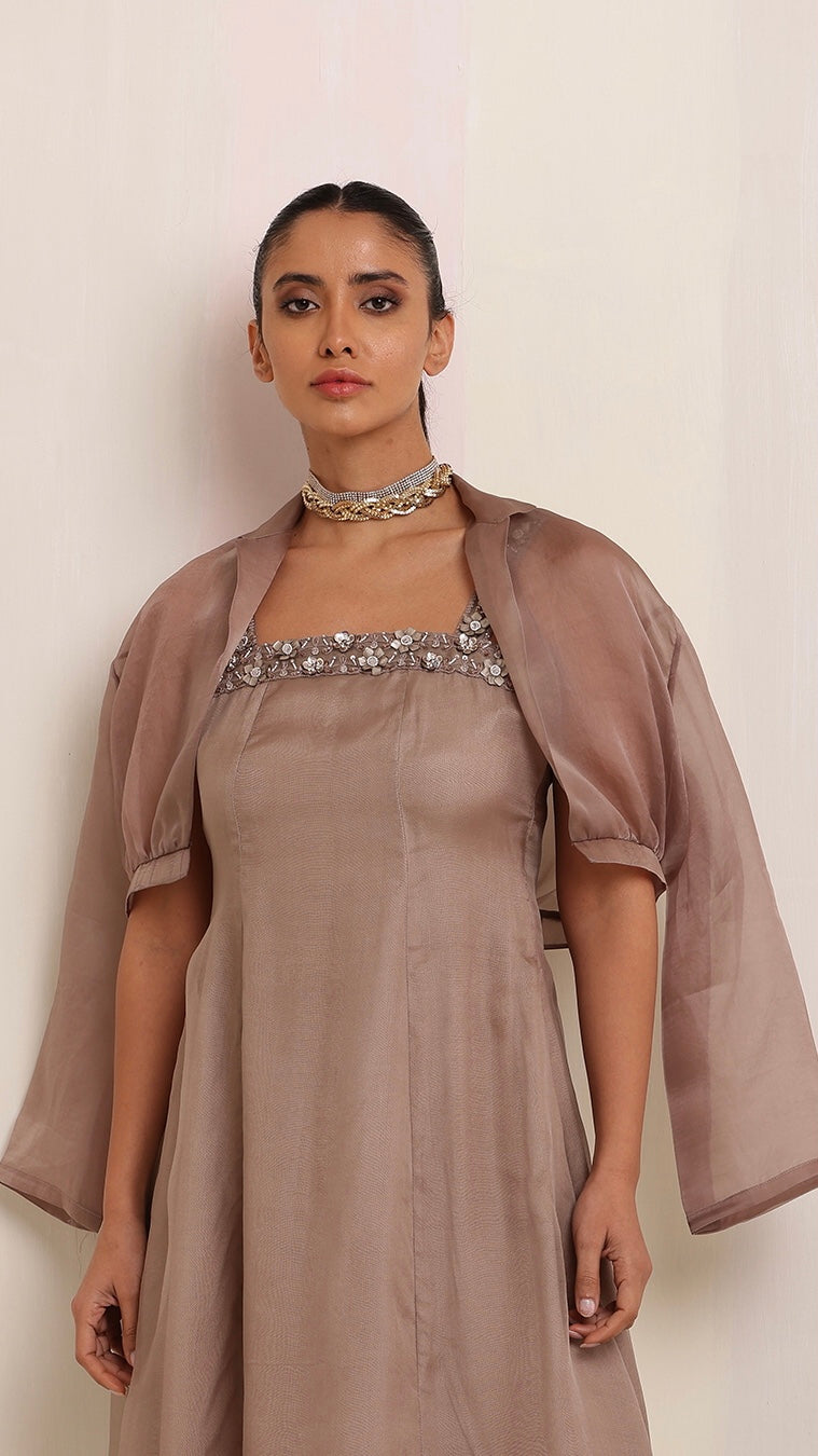 Exuding timeless elegance, this brown-tone cut-sleeves long dress with intricate hand embroidery, paired with a luxurious organza satin jacket, creates a stunning fusion of craftsmanship and sophistication.